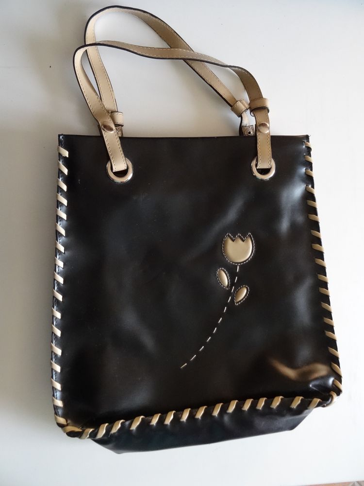 Description :Sac noir avec motif fleur marron clair / beige en très bon état. Une poche au dos, une petite pochette dans la poche principale. Dimensions: 30 x 30 cm.